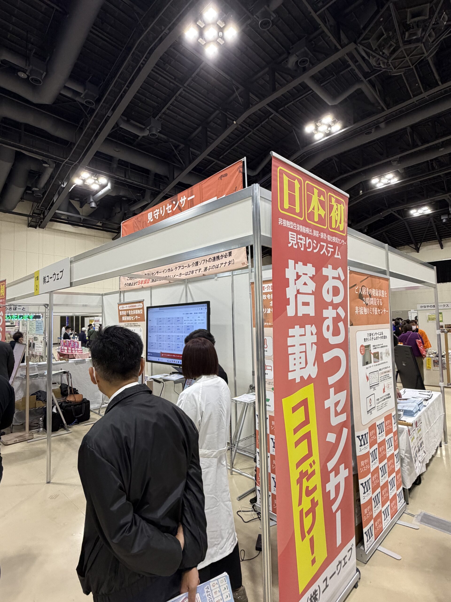当社は見守りシステムのブースを出展しています。 今回は、業界初の完全非接触で排尿検知ができるセンサーをご紹介しています。